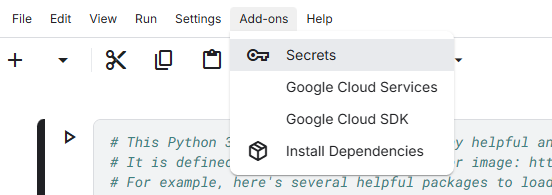 点击顶部菜单 Add-ons -> Secrets,添加 HF_TOKEN(你的 HuggingFace 访问令牌)。