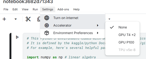 - 和Colab不同,因为Kaggle是为竞赛服务,很多竞赛是要求模型不联网的,所以我们在训练模型的时候,需要手动开启网络,也在顶部菜单栏的Settings中,点击Turn On Internet打开即可联网下载模型或者数据集。
