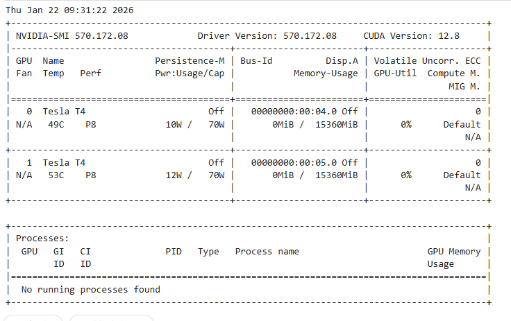 你应当能看到 两张 Tesla T4 显卡的列表 (GPU 0 和 GPU 1)。