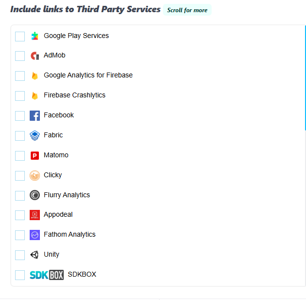 - Third Party Services: 勾选项目中实际使用的 SDK(如 Google Play Services, AdMob, Firebase Analytics)。这一步很重要,漏选可能会导致应用被下架。